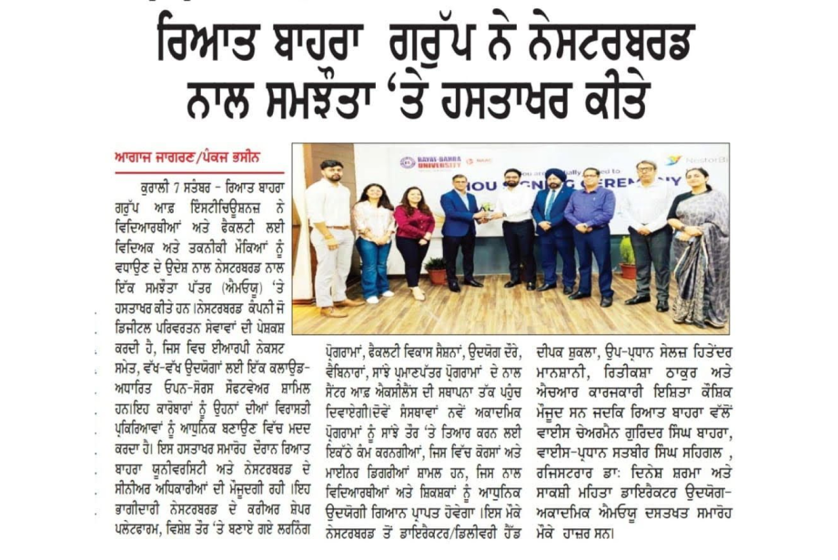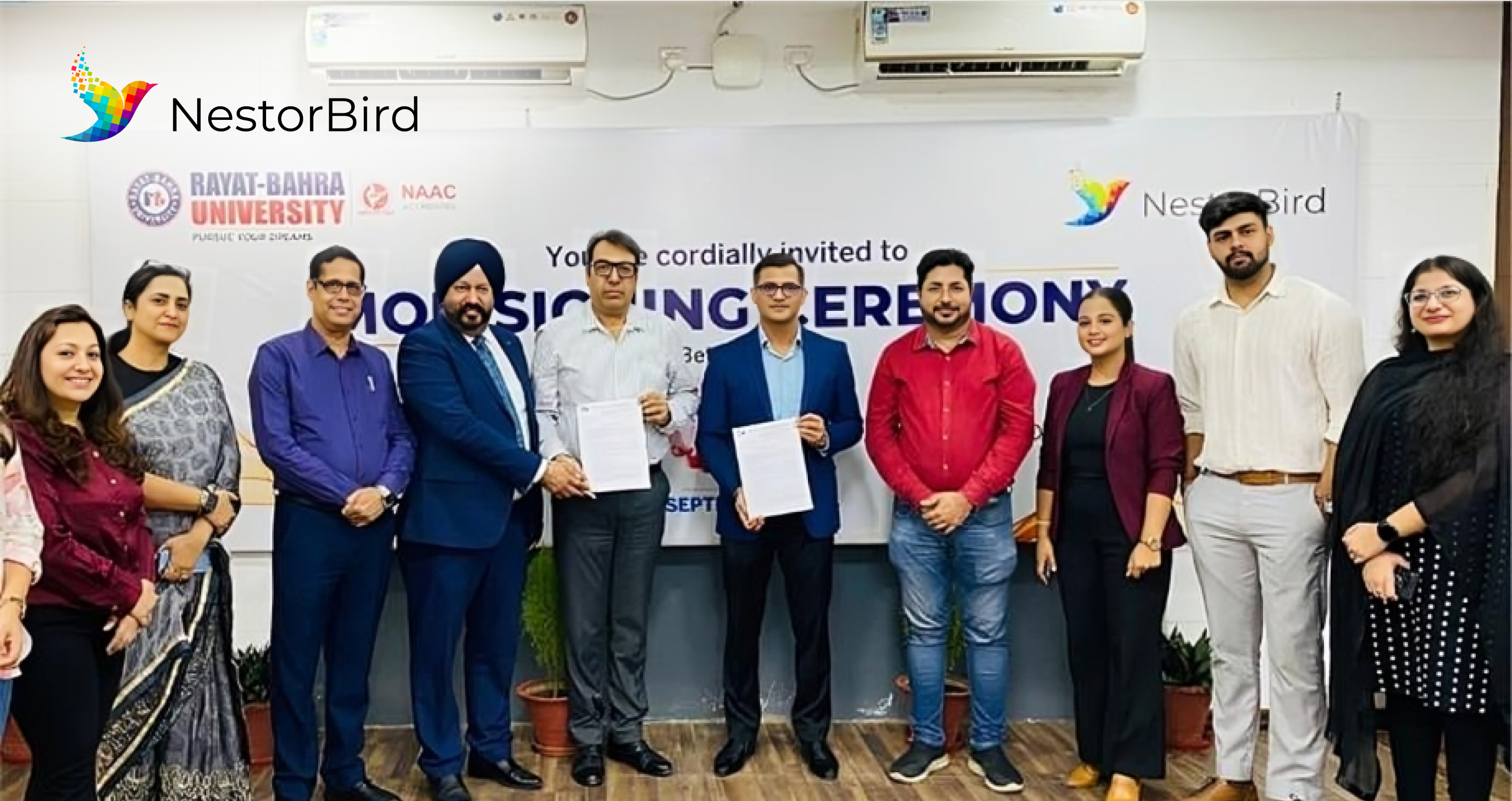 Rayat Bahra University (RBU) has signed an agreement with NestorBird to give students and teachers more chances to learn about new technology and skills. The signing event took place at the university, with leaders from both RBU and NestorBird present. The MoU was signed at a special ceremony held on campus, attended by senior officials and representatives from both organizations.